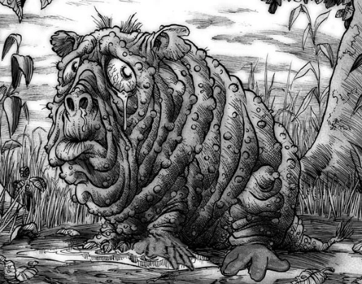 A squonk is of a very retiring disposition, generally traveling about at twilight and dusk. Because of its misfitting skin, which is covered with warts and moles, it is always unhappy. A further peculiarity is that it has webbed toes on their left feet but a clawed paw on the right. Hunters who are good at tracking are able to follow a squonk by its tear-stained trail, for the animal weeps constantly. Because of the marshy homeland of the squonk, these trails do not last very long; further, the dolorous pathway often blemishes the foot tracks the squonk might leave. When cornered and escape seems impossible, or when surprised and frightened, it may even dissolve itself in tears.
